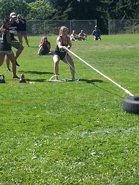 The first workout was a barbell complex -4 rounds of 10 deadlifts, 8 hang power cleans and 6 back squats at 95/135. The second event was definitely more mental -farmer carry 2 kb (35/55) out to marker then 5 thrusters, walk back in the rack position, repeat out but with 10 kb thrusters this time, followed by 15 and then 20 -all kettlebell thrusters must be done unbroken or you have to start that round again. This was a 7min AMRAP … The third (and potentially final) event was a series of 3 deadlifts then a butcher (prowler) push across the field. I can’t remember the weights for the guys but the women started off with 205, then the top 12 competitors moved on to 245 and then the top 6 moved on to 275 -this was a great one for me, right up my alley!!! The top 8 individuals of the day qualified for a fourth (and thankfully) final workout -I was pretty tired and sunburned by this point so my memory of it is a bit sketchy but here it is: lunge out to marker and back with 95lb barbell on your back, grab a pair of straps attached to kettlebells (35lbs) and walk back out to marker, turn around and drag a tire halfway out to marker, grab hanging kettlebells again and walk back to starting point, turn around, drag tire back to starting point and finish off with more weighted walking lunges, out to marker and back again!! Phew! Fast and sweet!!