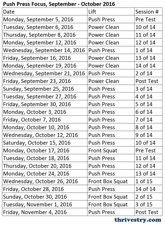 Want to know what days to expect the push press? Screen shot the schedule so you can plan your week. The days that are a Sunday will be rescheduled into the week.