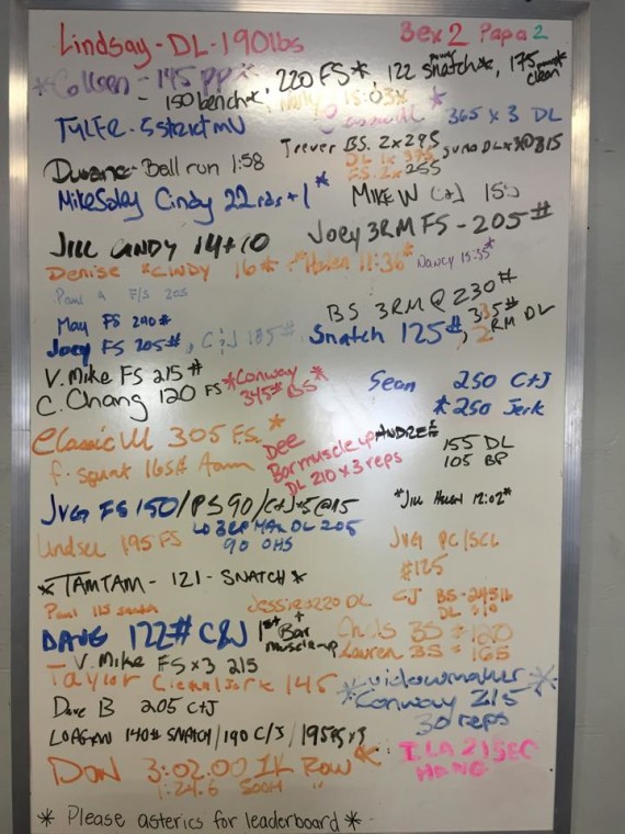 The PR board has been cleared! Tons of awesome personal records so far this summer, keep them coming! Any time you set a new PR in a workout or on a lift, make sure to put it on the board!