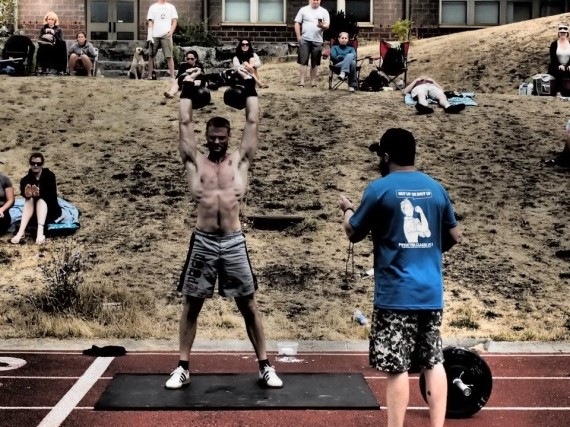 Last Friday, a small group of us went down to Seattle to compete in the 3rd annual Pipehitters competition hosted by Old Country Iron. Pipehitters is a Crossfit comp that focuses on the heavy stuff so naturally Jeremy Bomhof and Adrianna signed up, for reasons I am still not sure of, I did too. After an awesome sleep that involved an air-conditioned room and no snoring dogs, I was ready to go Saturday morning. Unfortunately the cabbie was not and I just about didn’t make the registration time line but got there with about a minute to spare. The first workout was demo’d and it looked like a fun one. Tire pulls, front squats and waiter’s walks. For three rounds we performed: